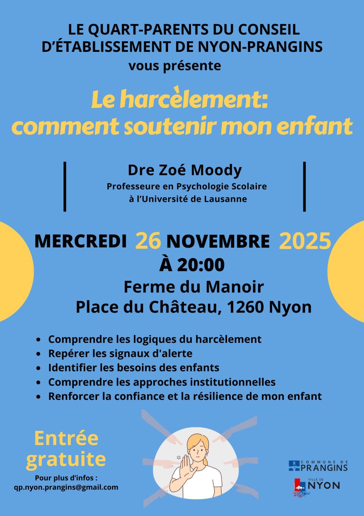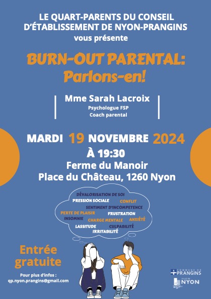Lors de ces conseils d’établissement, nous avons l’opportunité de soumettre d’éventuelles questions concernant les difficultés rencontrées par les parents, tout en jouant un rôle de force de proposition sur des sujets liés à la scolarité des enfants. Nous sommes également informés des nouveaux projets mis en place dans les différentes écoles de Nyon et Prangins, recevons des réponses à nos interrogations et sommes amenés à donner notre avis sur la mise en œuvre des initiatives proposées.